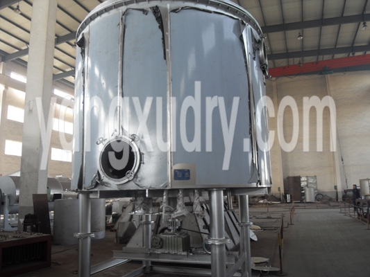 湿物料自加料器连续地加到干燥器上部第一层干燥盘上,带有耙叶的耙臂作回转运动使耙臂作回转运动使耙叶连续地翻抄物料。物料沿指数螺旋线流过干燥盘表面,在小干燥盘上的物料被移送到外缘,并在外缘落到下方的大干燥盘外缘,在大干盘上物料向里移动并从中间落料口落如下一层小干燥盘中。大小干燥盘上下交替排列,物料得以连续地流过整个干燥器。中空的干燥盘内通入加热介质,加热介质形式有饱和蒸汽、热水和导热油,加热介质由干燥盘的一端进入,从另一端导出。已干物料从最后一层干燥盘落到壳体的底层,最后被耙叶移送到出料口排出。湿份从物料中逸出,由设在顶盖上的排湿口排出,真空型
